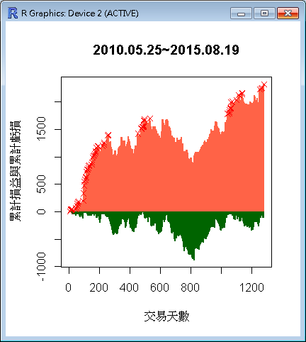 下圖是一個做在小台策略的損益,我們回測2010.05.25~2015.08.19某個當沖策略,拿15萬做本金,每日若有交易,則單口進單口出,停損點設在30點(NT 1,500元),沒有任何資金控管,績效如下: